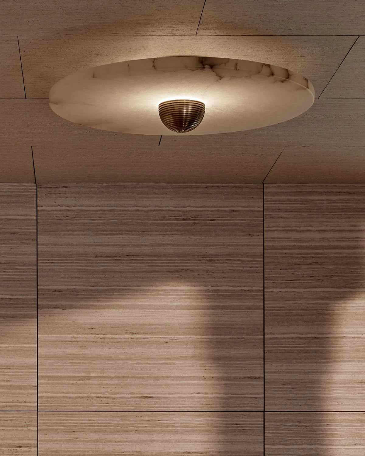 THE TRANSLUCENT ALABASTER PLANES OF THE MEDIAN SERIES ARE INTERSECTED BY A FLUTED BRASS FORM, REFERENCING TRADITIONAL MIDDLE EASTERN JEWELRY WHILE PUSHING IT THROUGH A FUTURIST LENS. THE STONE GLOWS FROM A LIGHT SOURCE THAT REMAINS HIDDEN, ILLUMINATING THE RELATIONSHIP BETWEEN THE SOLID AND THE PERMEABLE.