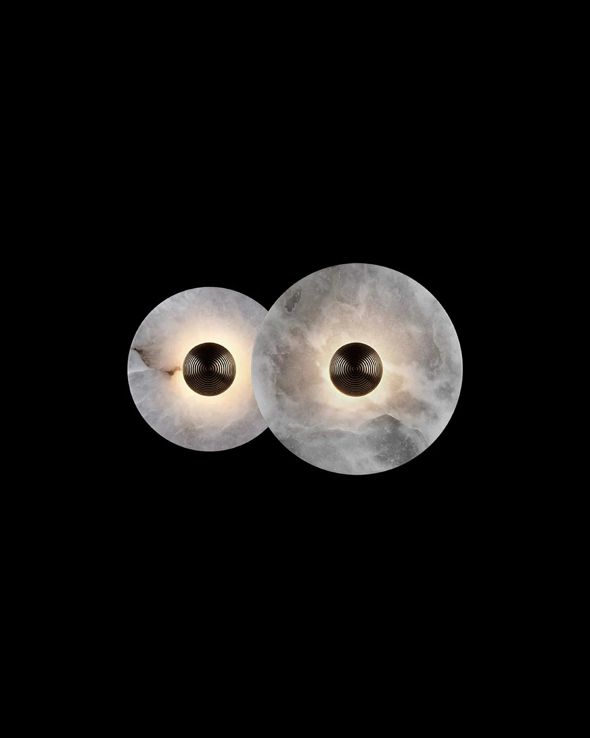 THE TRANSLUCENT ALABASTER PLANES OF THE MEDIAN SERIES ARE INTERSECTED BY A FLUTED BRASS FORM, REFERENCING TRADITIONAL MIDDLE EASTERN JEWELRY WHILE PUSHING IT THROUGH A FUTURIST LENS. THE STONE GLOWS FROM A LIGHT SOURCE THAT REMAINS HIDDEN, ILLUMINATING THE RELATIONSHIP BETWEEN THE SOLID AND THE PERMEABLE.