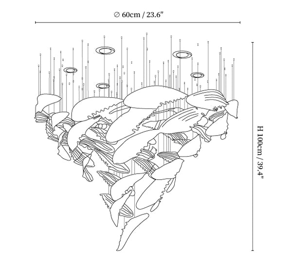 The Bennett Chandelier captures the fluid movement of ocean schools with its layered design and interplay of light and shadow. A dynamic and elegant addition to any space. Benefits: Enhance the ambiance of any room with the Bennett Chandelier's fluid design and interplay of light and shadow. Its dynamic aesthetic will elevate the look and feel of your space, adding a touch of elegance and sophistication.