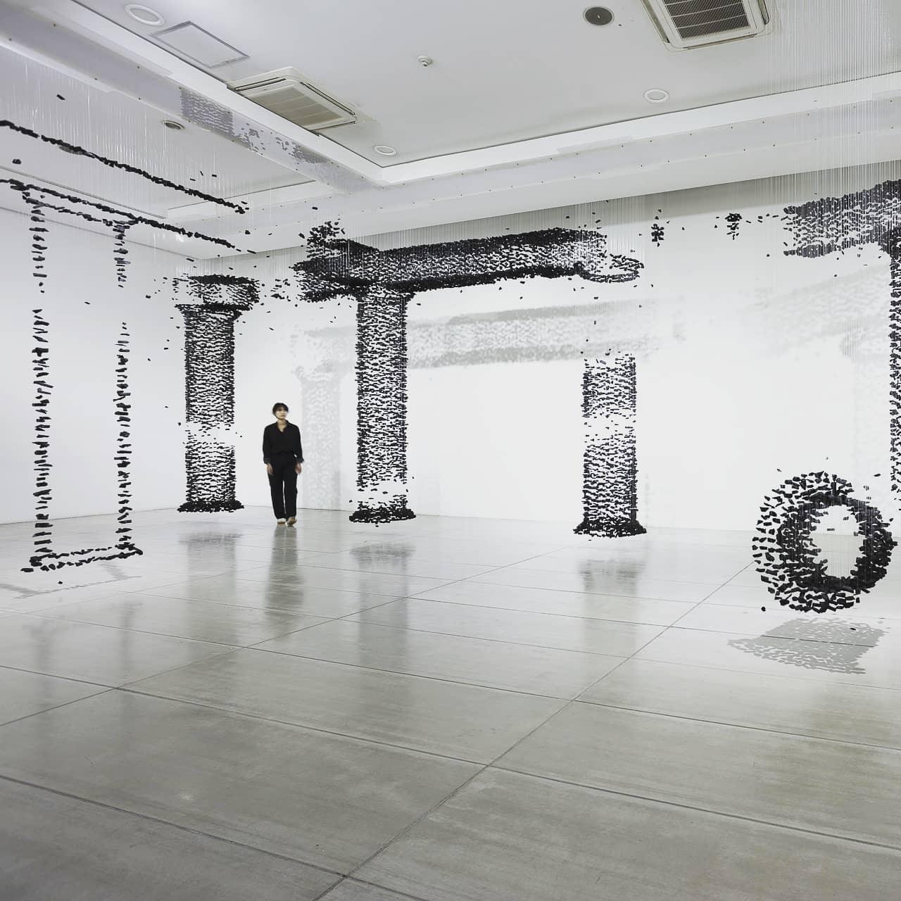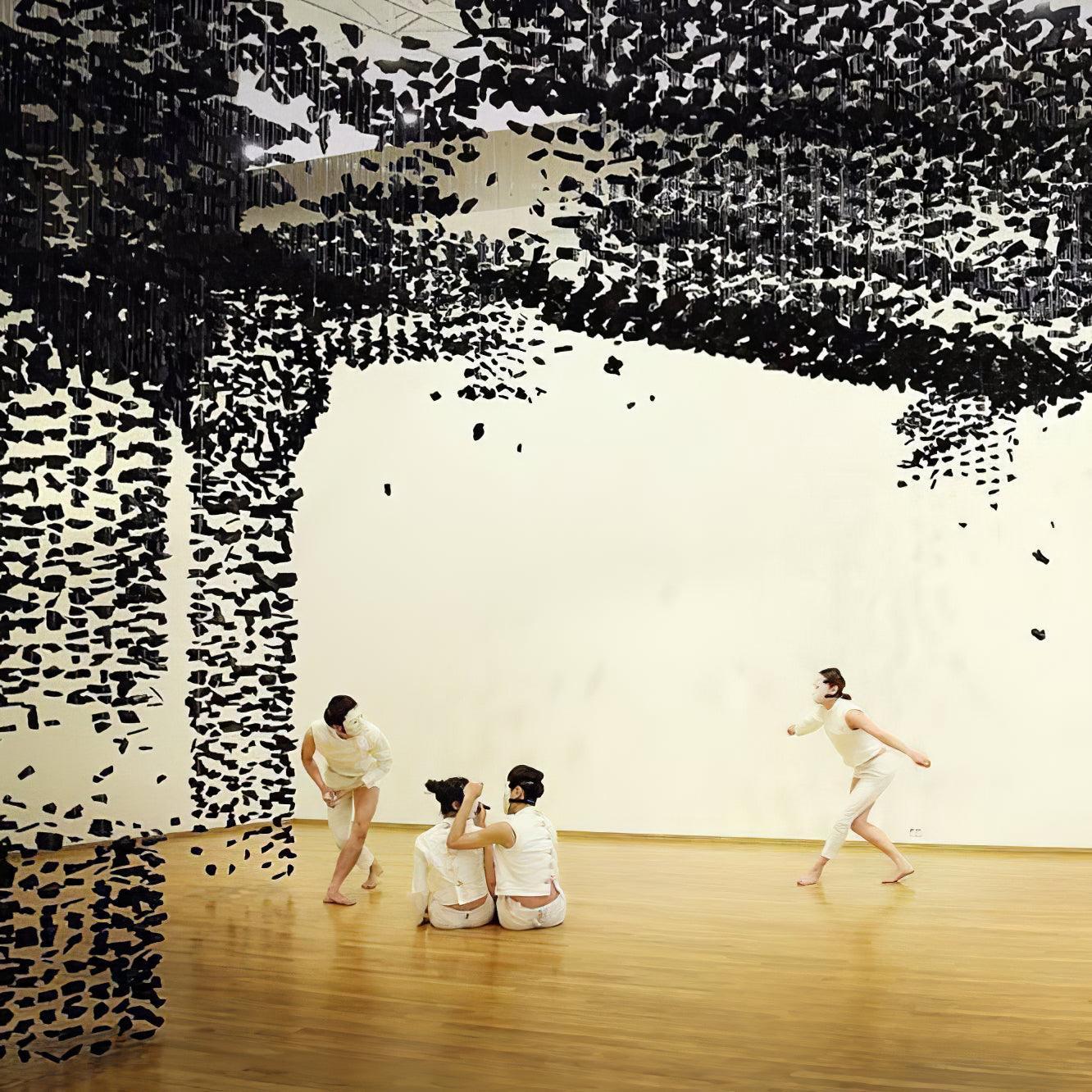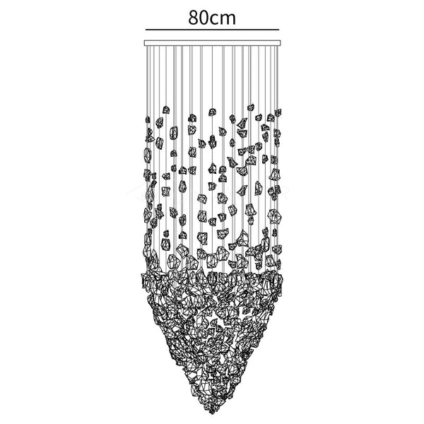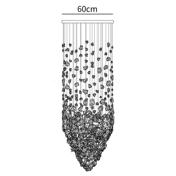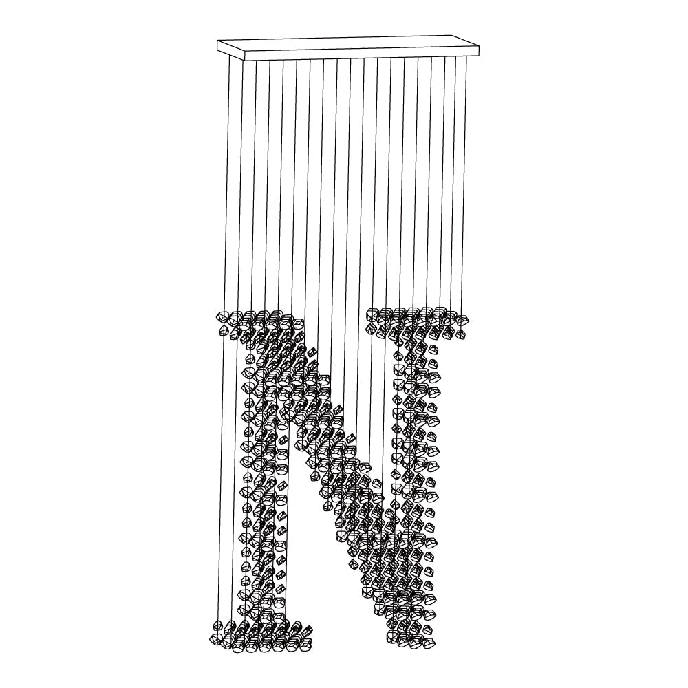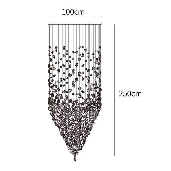 Starting with one piece of charcoal, the artwork crafted for this chandelier extends into a linear composition before spreading to occupy the area, conveying the idea that everything is connected and the universe can be found in a single point. The concept is concise and understandable.
