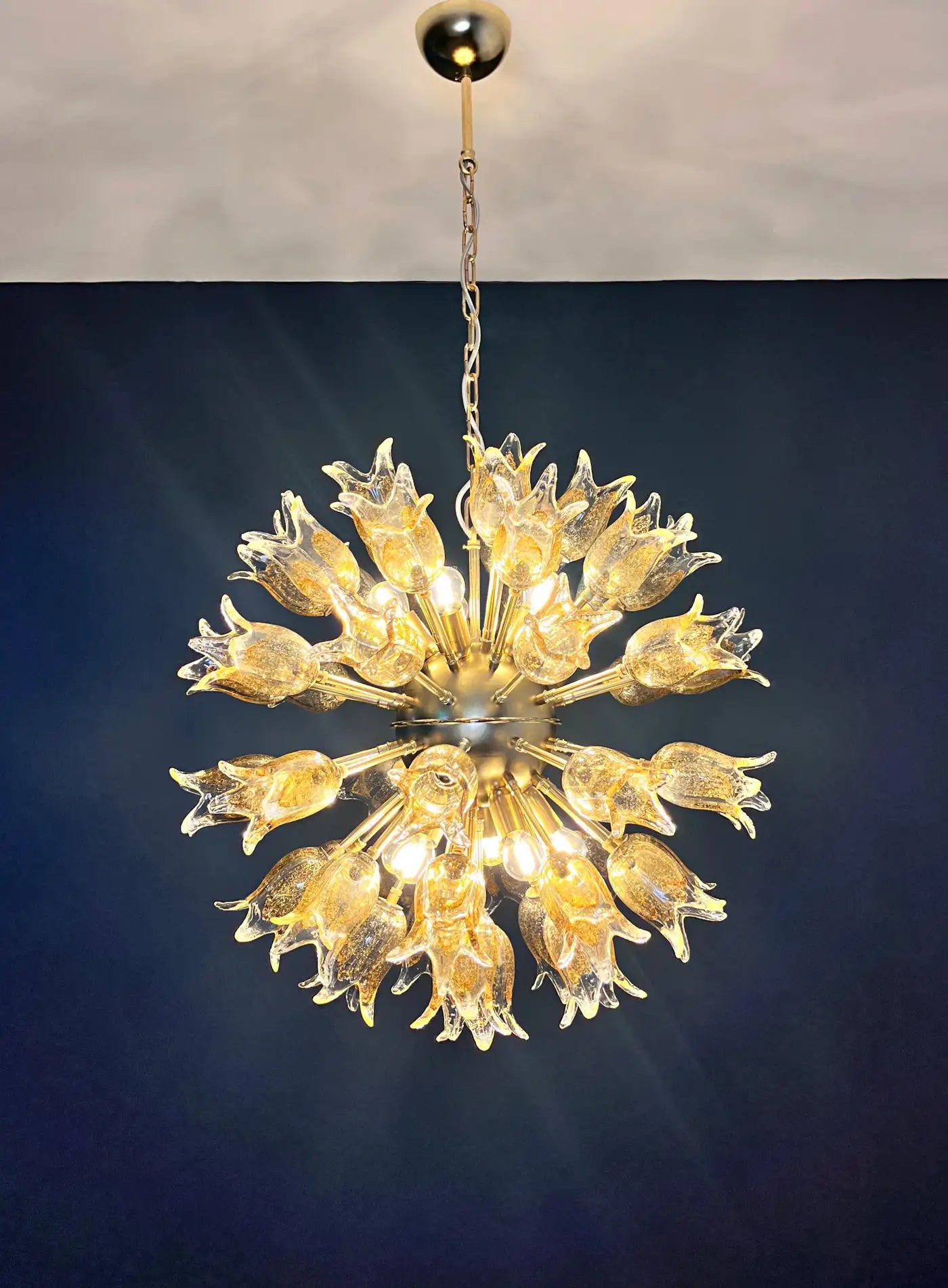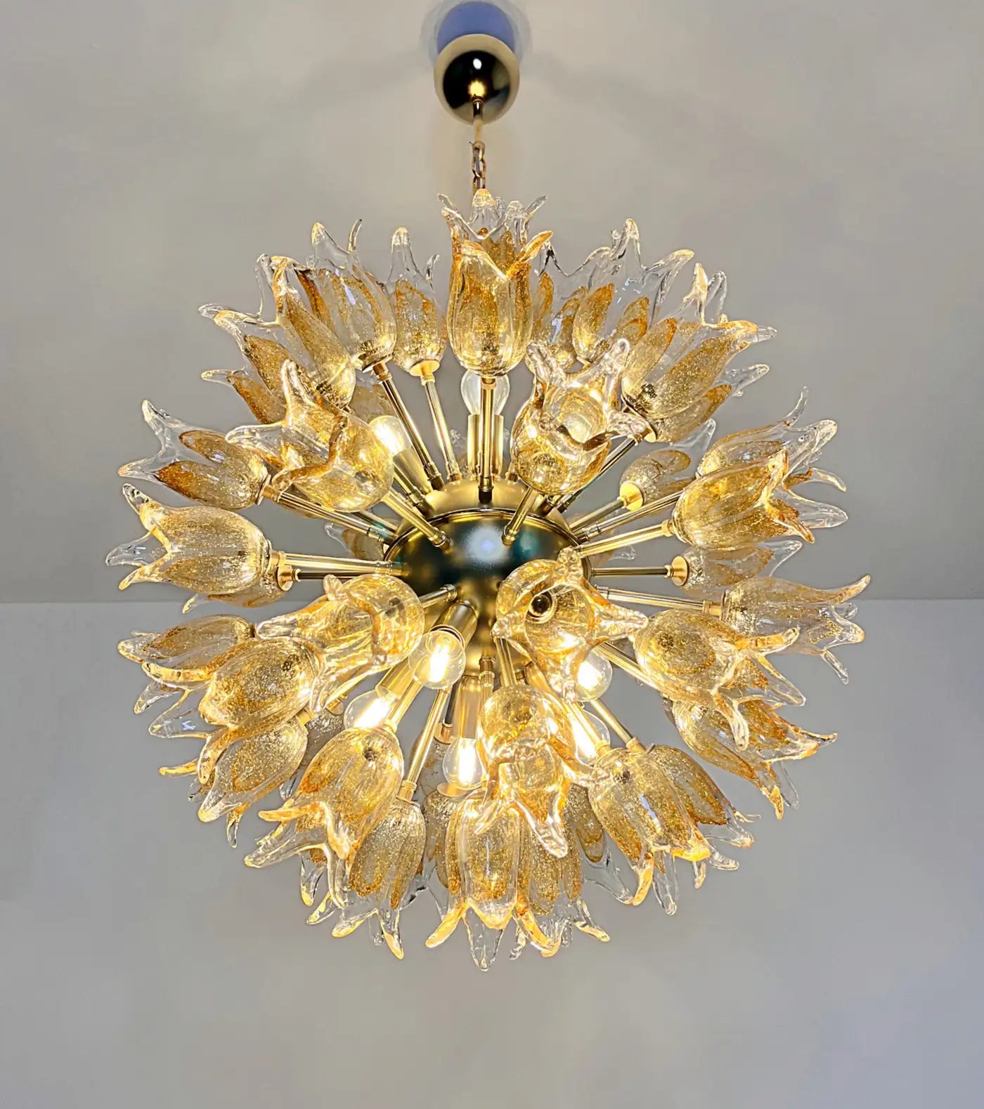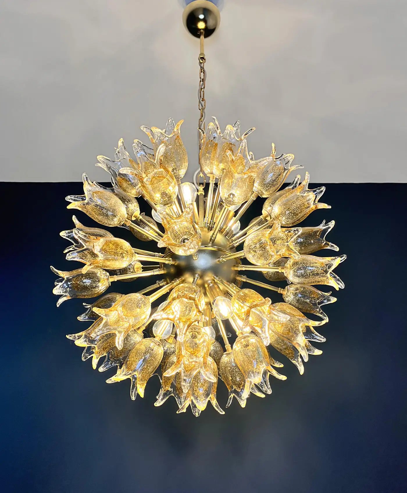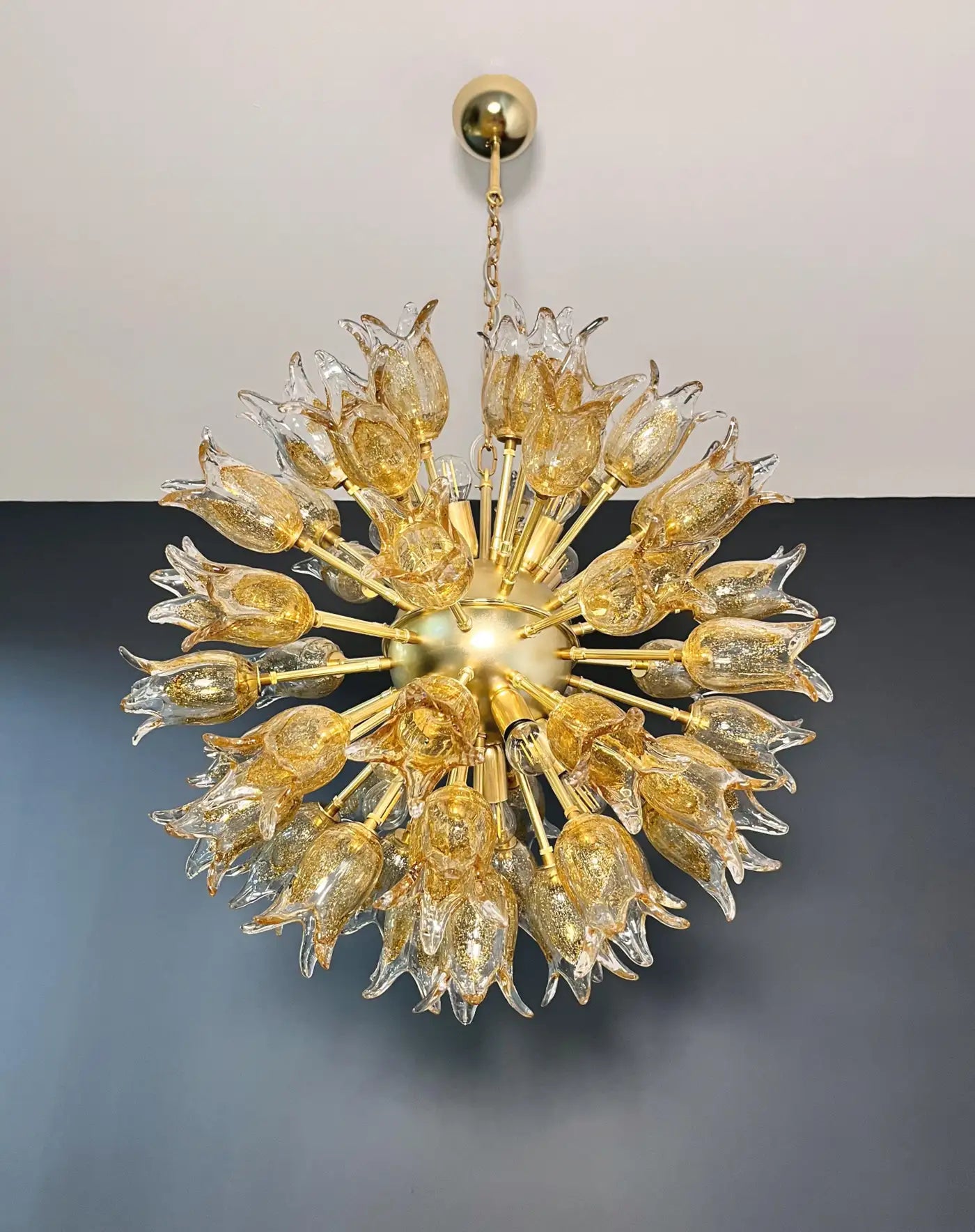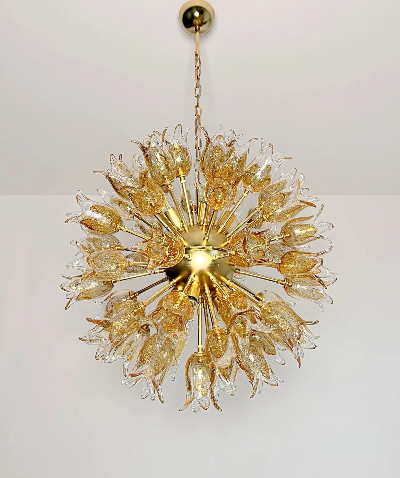 This elegant chandelier stands out for its sophisticated radial design. With a total height of 120 cm (including chain) and a diameter of 70 cm, it is an ideal statement piece for large, refined spaces. Crafted in brass-plated metal, it features a spherical central body from which 51 golden arms branch out, each terminating in a clear glass floral decoration. The glass elements, 12 cm high and 10 cm in diameter, are embellished with internal golden details that reflect the light, creating a sparkling and sophisticated effect. The chandelier is suspended by a brass-plated chain connected to a circular brass-plated base, completing its aesthetic. Weighing 22 kg, it is a solid structure that combines modern design and quality materials.