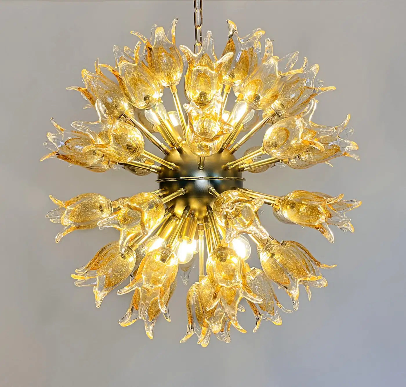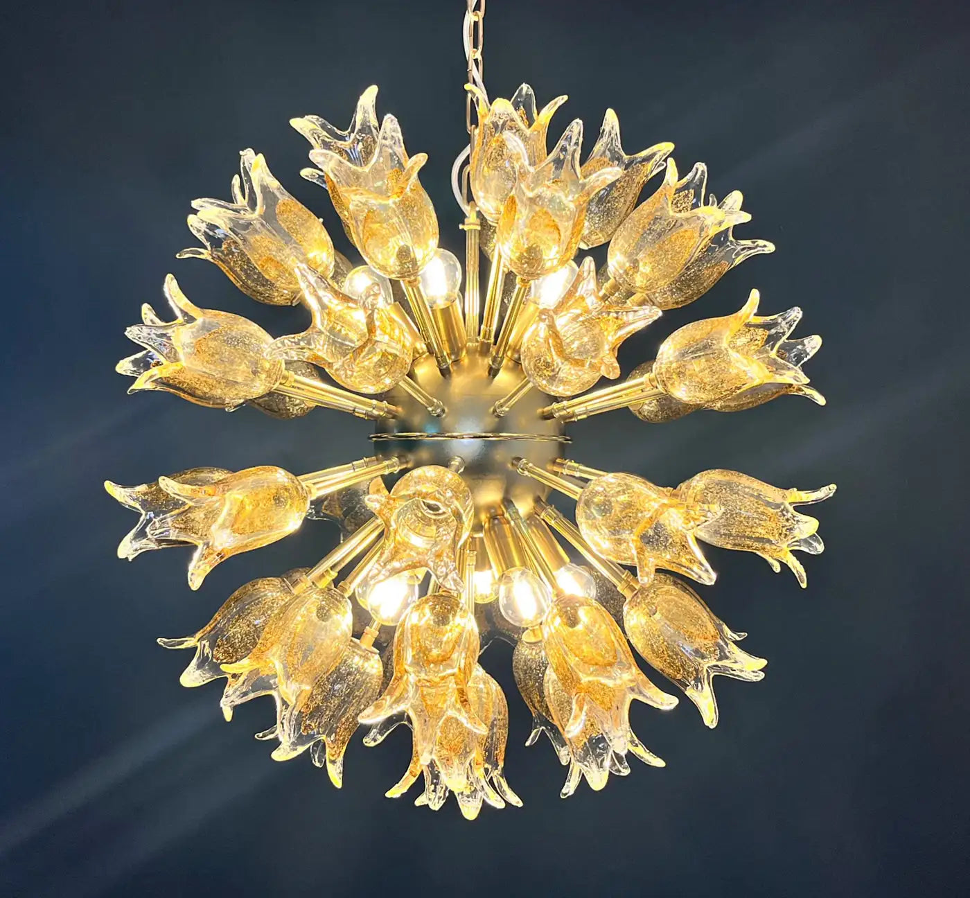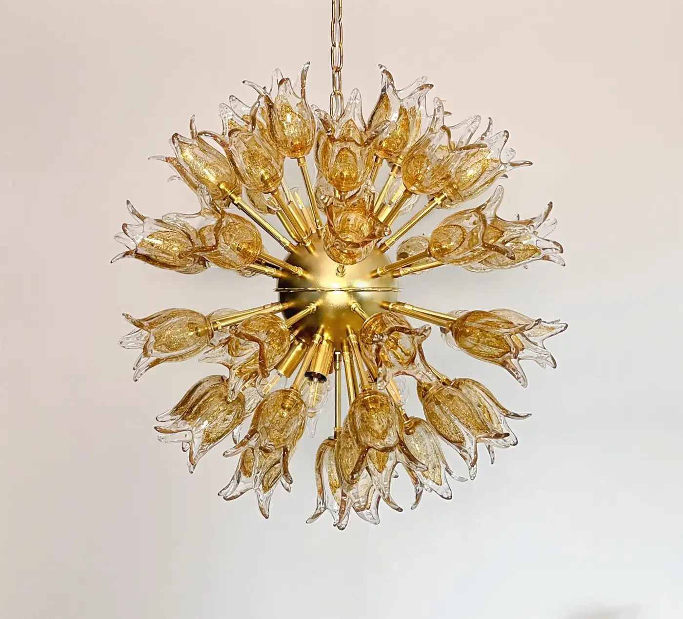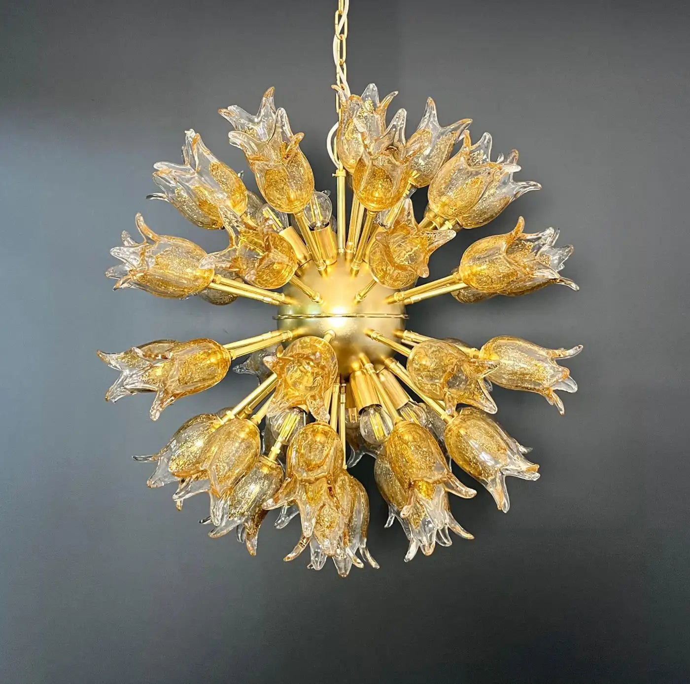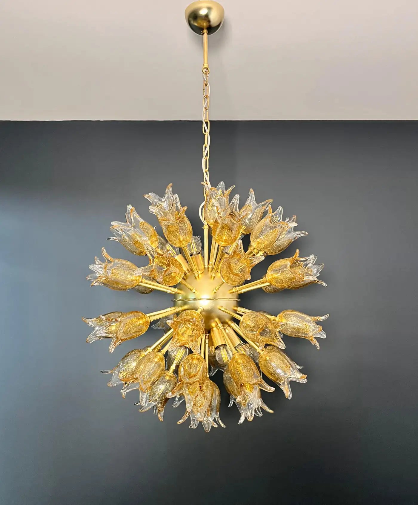 This elegant chandelier stands out for its sophisticated radial design. With a total height of 120 cm (including chain) and a diameter of 70 cm, it is an ideal statement piece for large, refined spaces. Crafted in brass-plated metal, it features a spherical central body from which 51 golden arms branch out, each terminating in a clear glass floral decoration. The glass elements, 12 cm high and 10 cm in diameter, are embellished with internal golden details that reflect the light, creating a sparkling and sophisticated effect. The chandelier is suspended by a brass-plated chain connected to a circular brass-plated base, completing its aesthetic. Weighing 22 kg, it is a solid structure that combines modern design and quality materials.