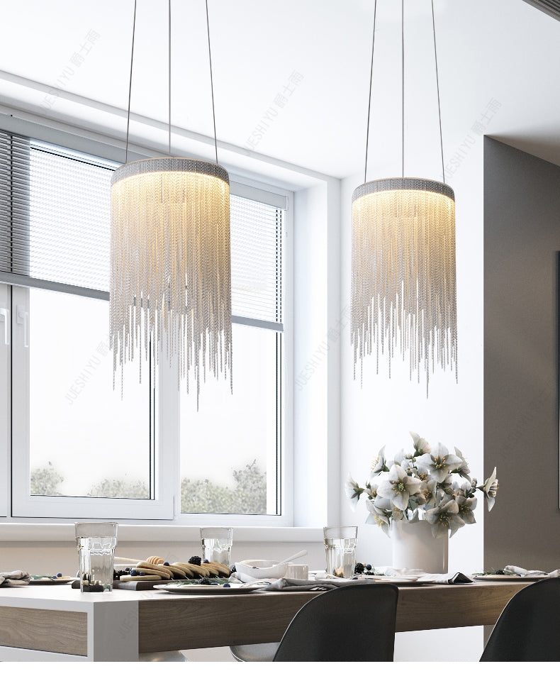 | Let the Fiona bring some spark to your dining room. With an industrial style that contrasts bold and delicate, this lamp fits any aesthetic and a range of spaces. Adorned with chains and tassels that remind us of bohemian style, this lamp can bring a hint of nature indoors. A perfect fit for modern spaces. |
