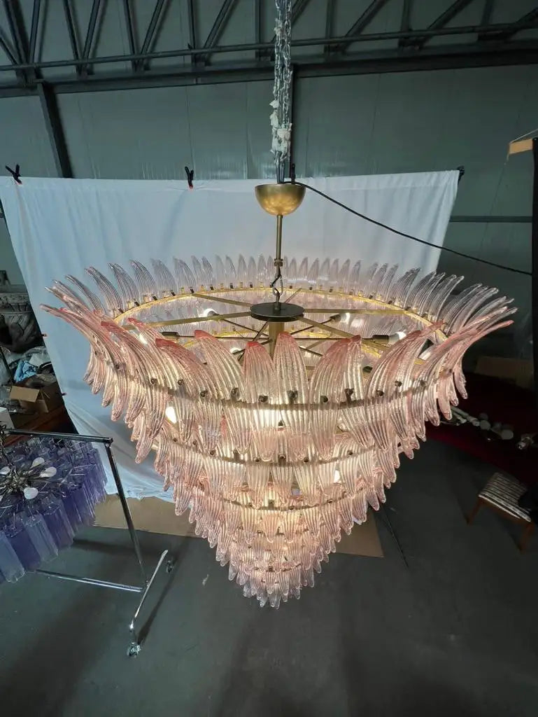 Majestic "palmette" chandelier made by Murano make 330 Pink color glasses. Structure in gold colored metal.