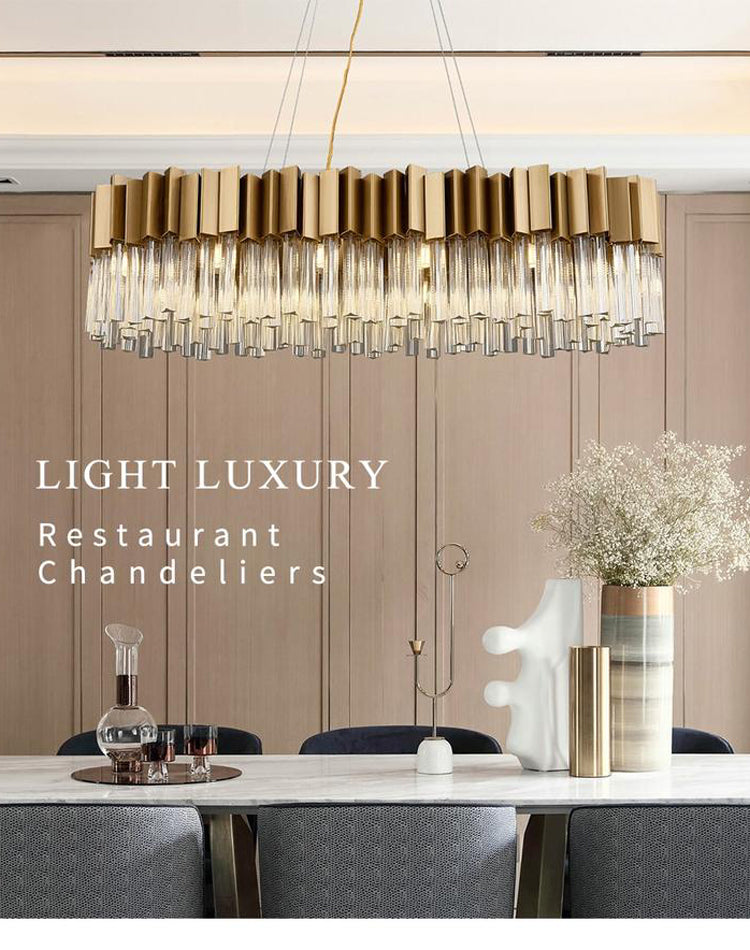 Modern crystal oval chandelier, golden stainless steel lamp body, and high-quality K9 crystals. Excellent fixture for illuminating long dining room tables.