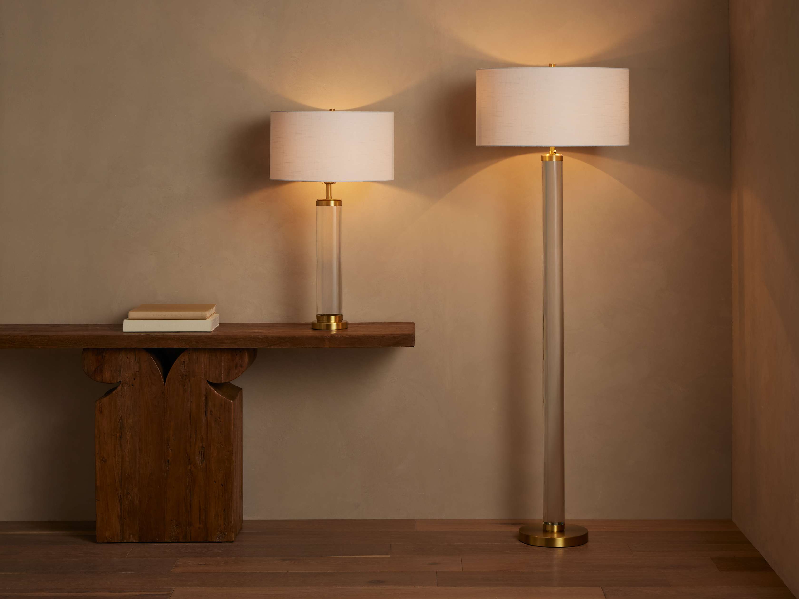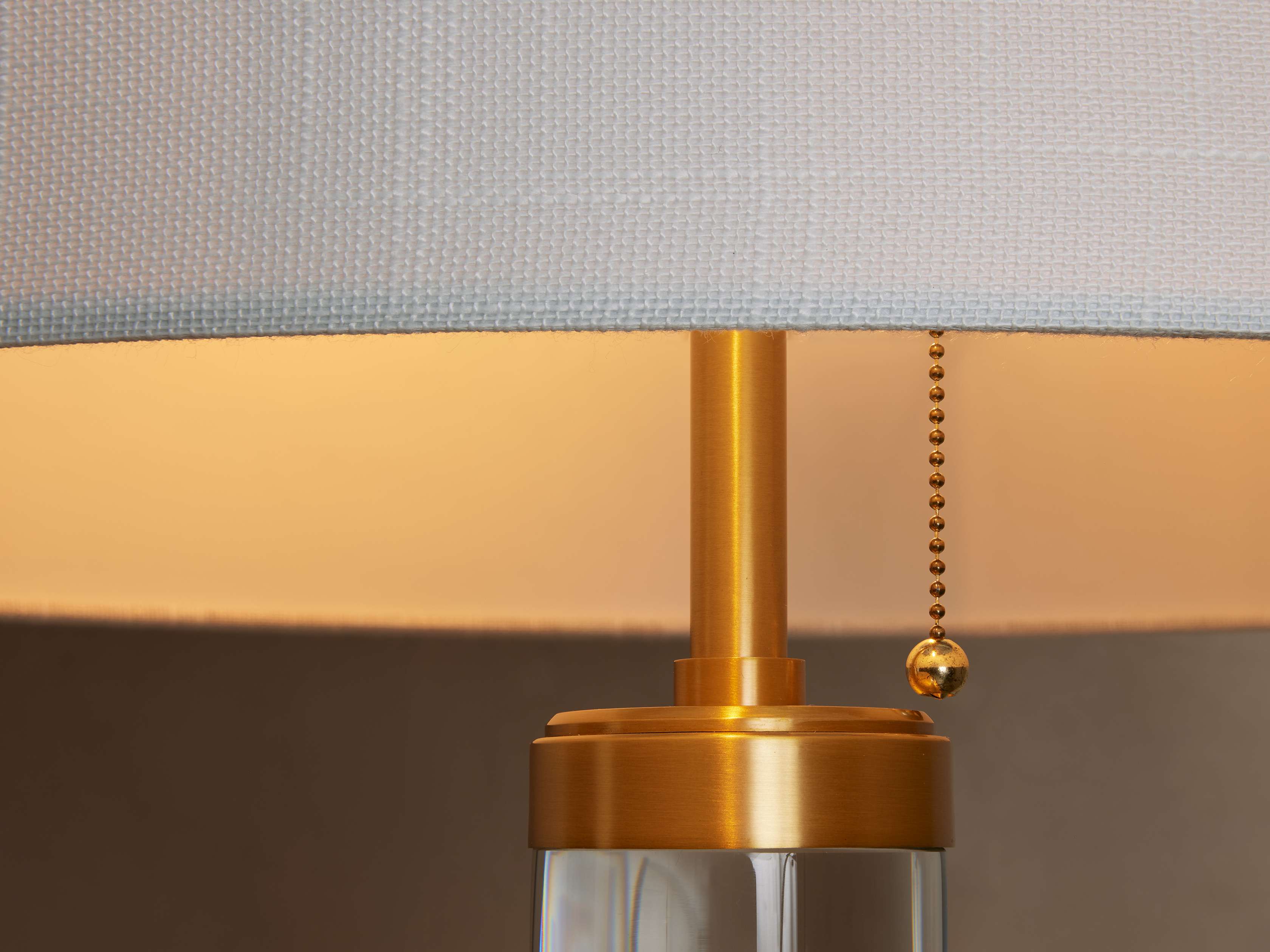 • Crafted with a clear crystal column and brass-finished metal accents, each lamp is elegantly topped with a linen shade.