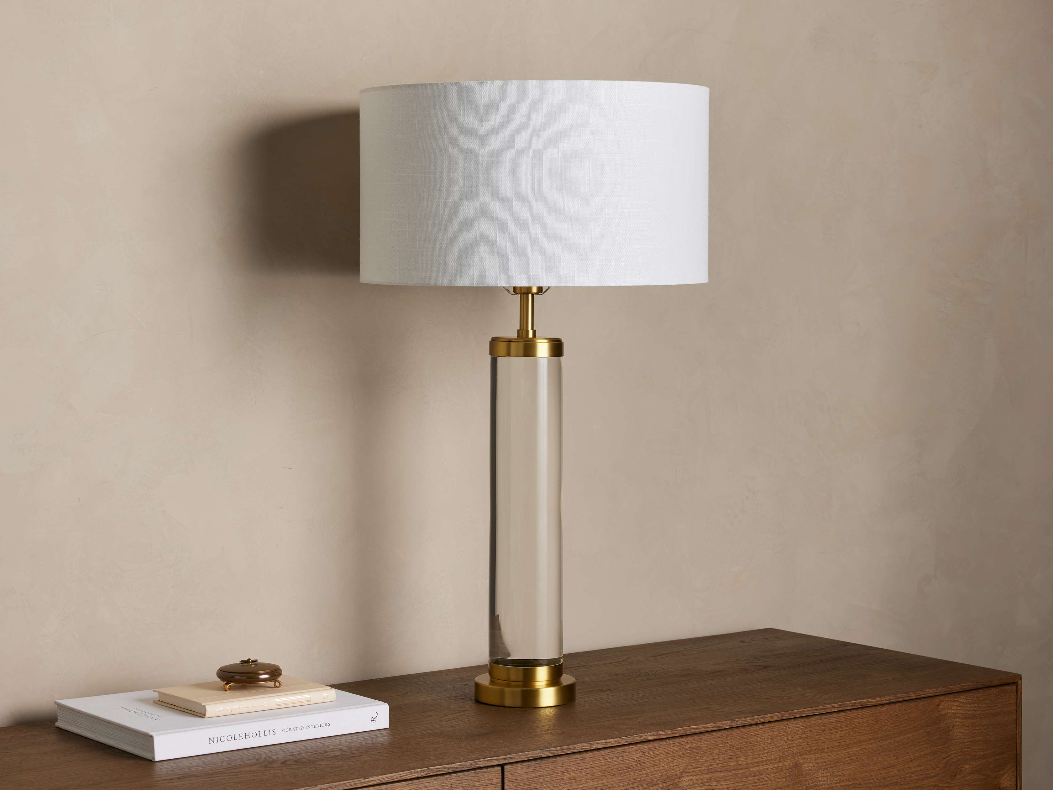• Crafted with a clear crystal column and brass-finished metal accents, each lamp is elegantly topped with a linen shade.