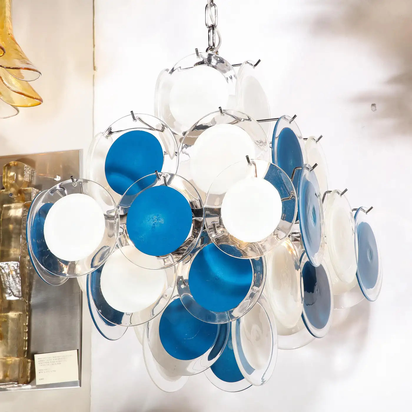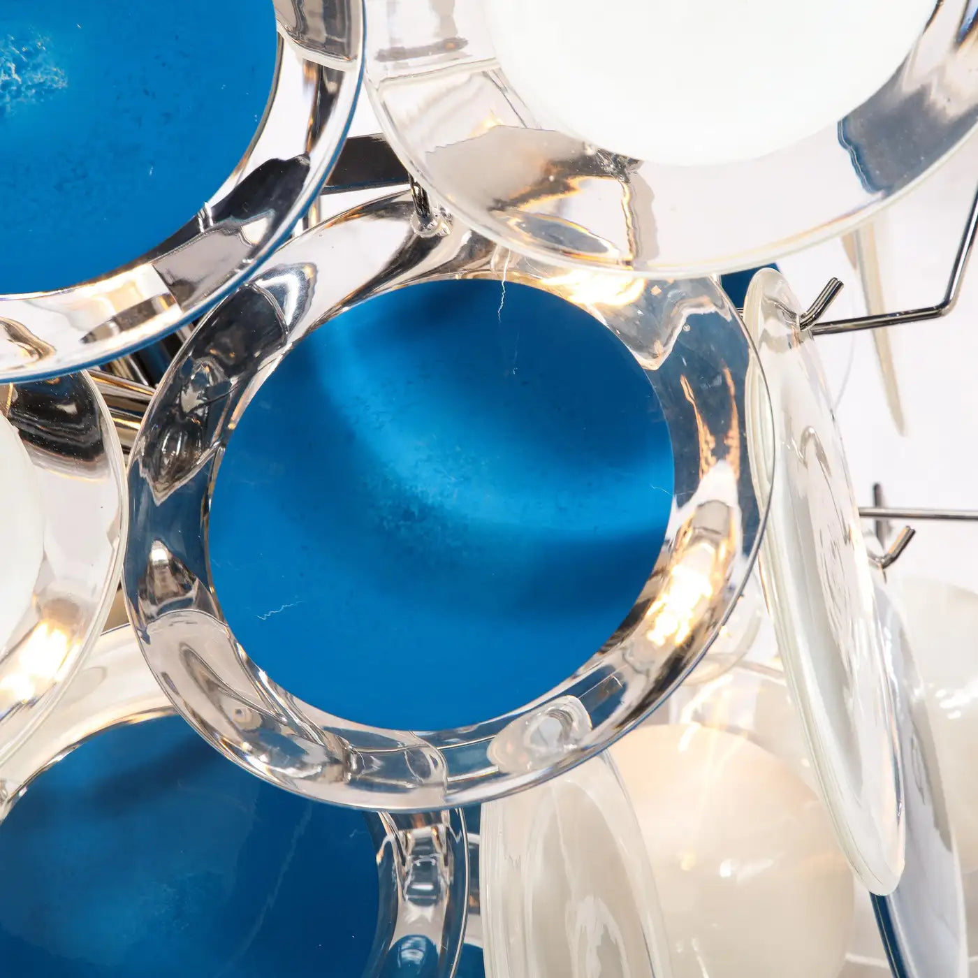 Modernist Pagoda Chandelier in Nickel & Handblown Murano White and Blue Discs
