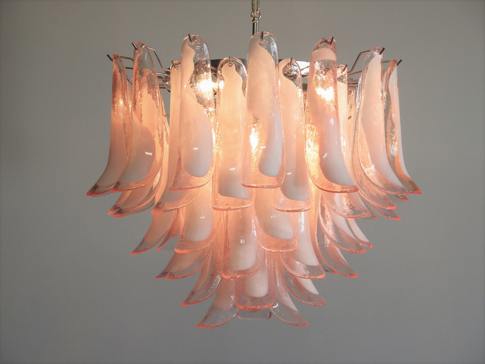 This masterpiece of an Italian chandelier is adorned with 53 Rose Petal glass pieces. With its 53 hand-blown Murano glass elements, this chandelier is sure to be a stunning focal point in any room it graces. The frame is standard in a silver patinated chrome finish (as shown in the pictures), but it is also available in matte gold, shiny gold, and shiny chrome.