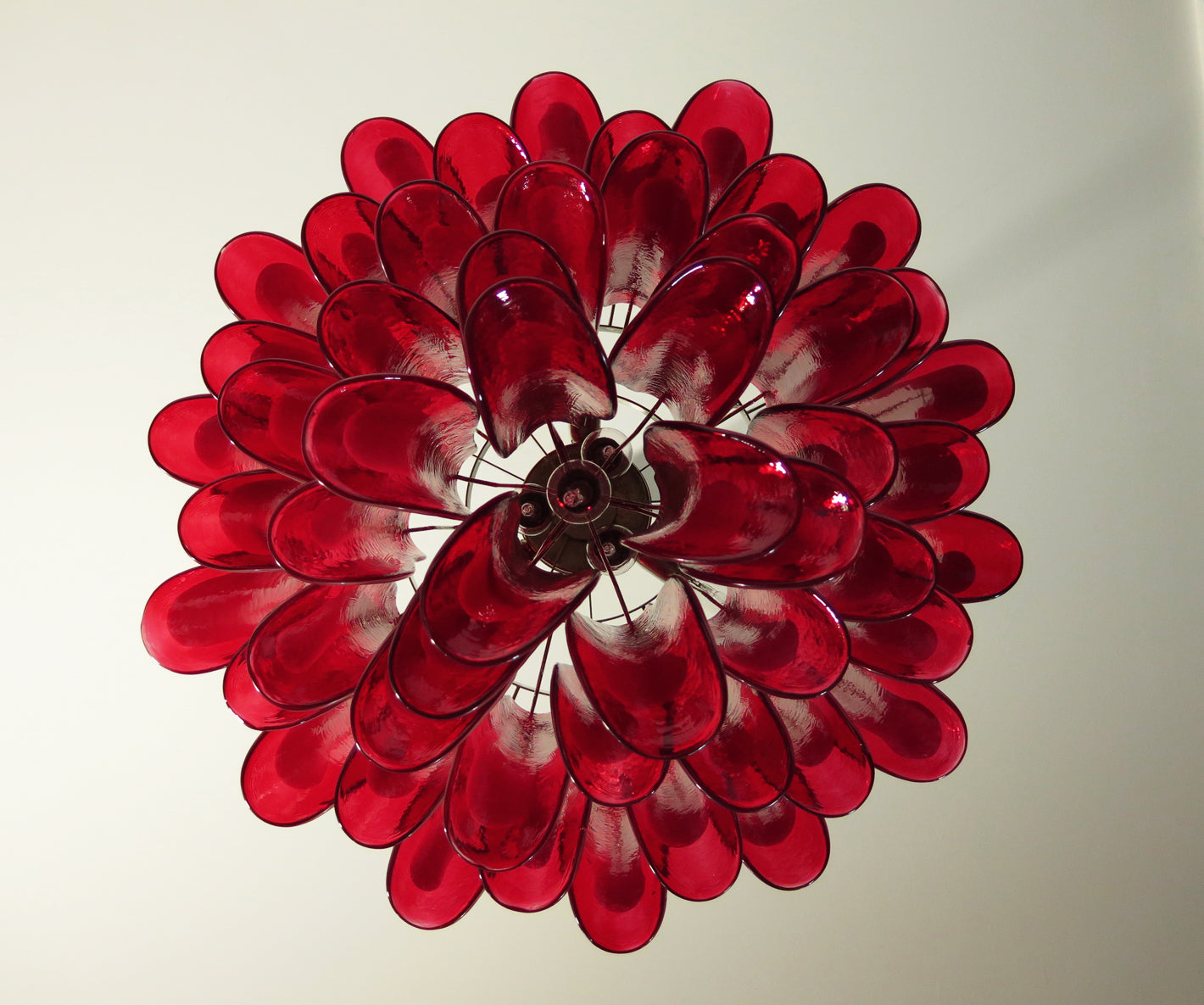 This masterpiece of an Italian chandelier is adorned with 53 Red Petal glass pieces. With its 53 hand-blown Murano glass elements, this chandelier is sure to be a focal point in any room it graces. The frame comes standard in silver patinated chrome (as shown in the pictures), but it is also available in matte gold, shiny gold, and shiny chrome.