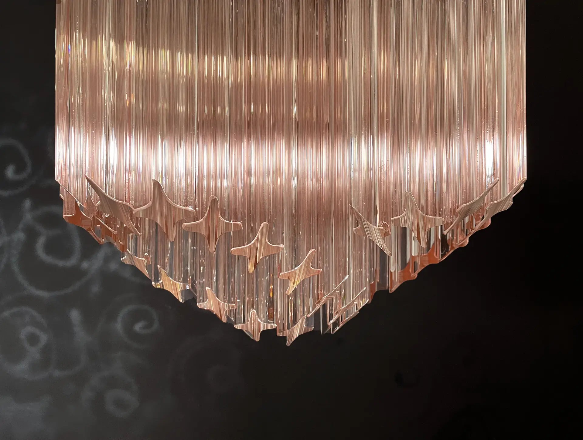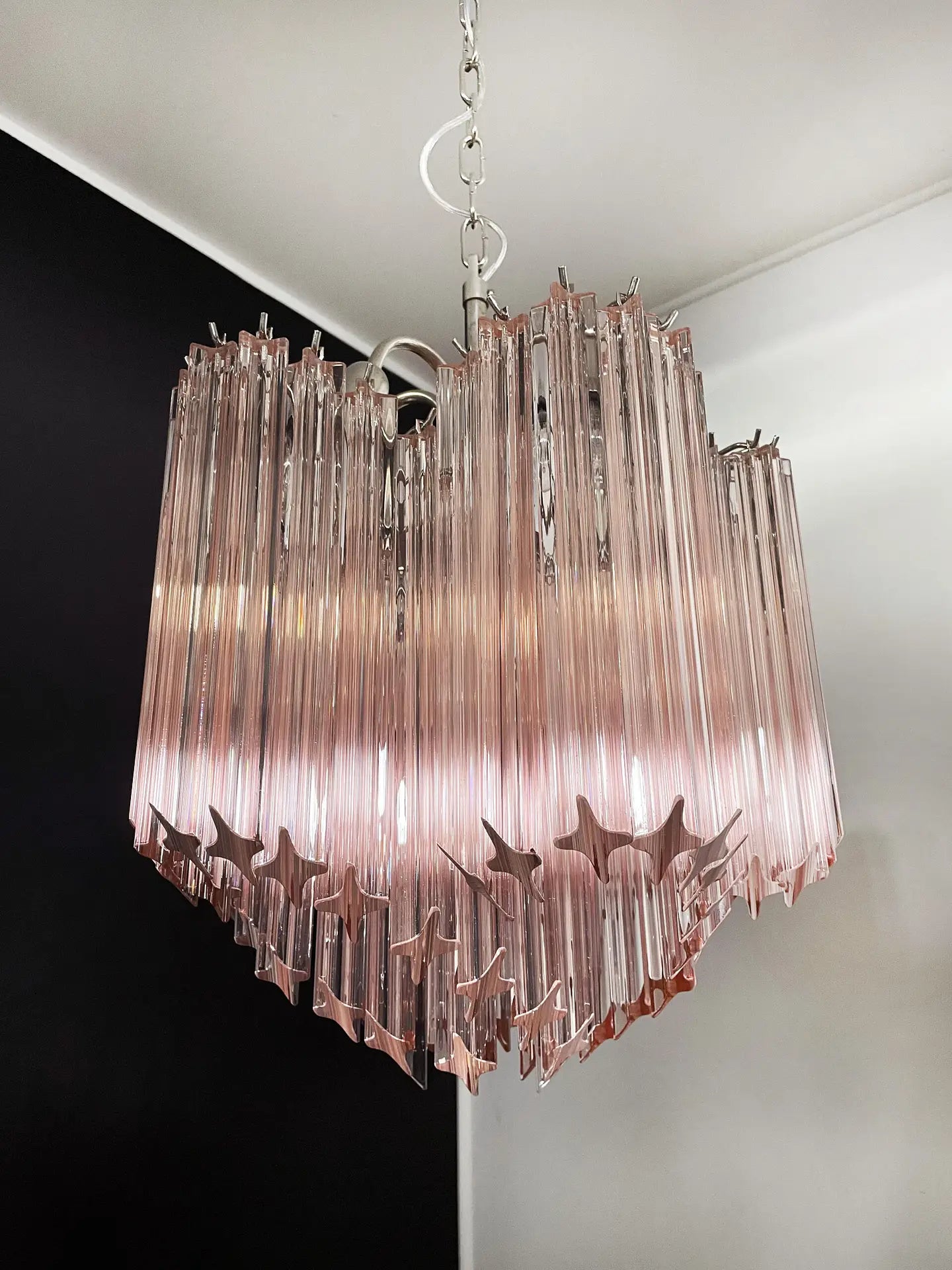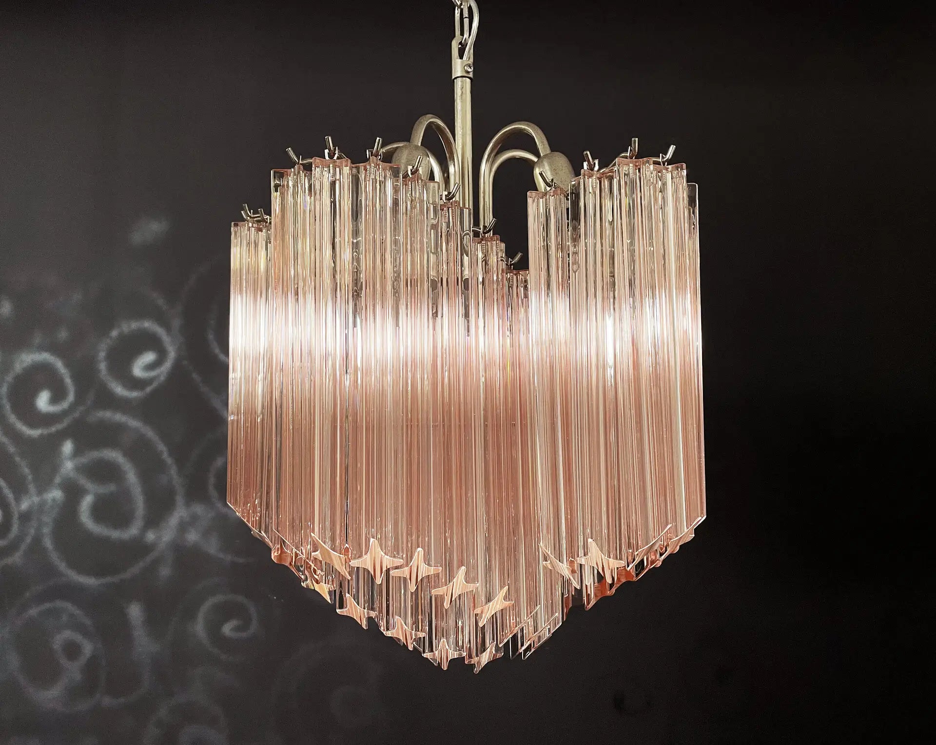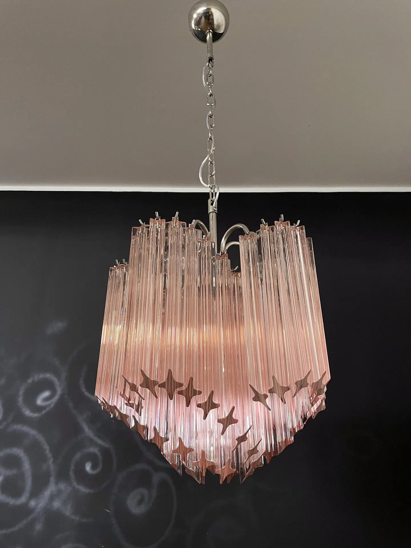 This masterpiece of an Italian chandelier is adorned with 60 Pink Prism glass pieces of the type quadriedri. With its 60 hand-blown Murano glass elements, this chandelier is sure to be a focal point in any room it graces. The frame is available in silver patinated chrome, matte gold, shiny gold, and shiny chrome.