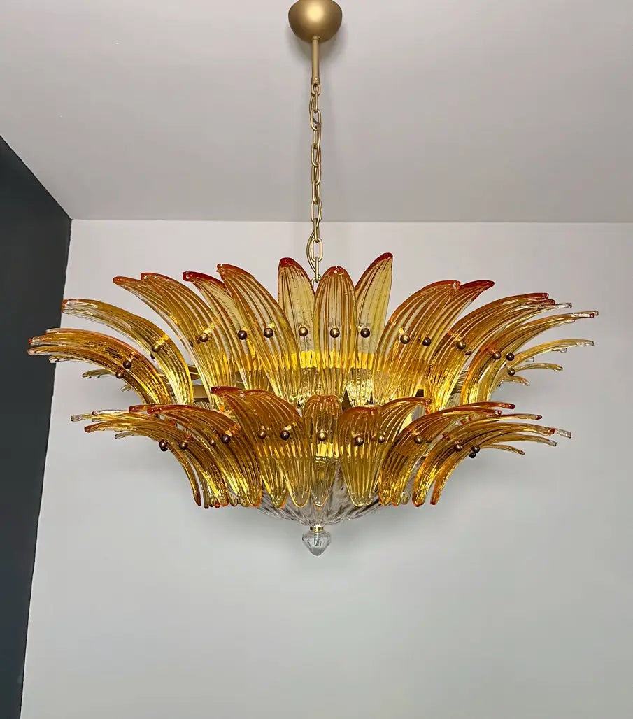 This masterpiece of an Italian chandelier is adorned with 82 Yellow Palm-shaped Murano glass pieces. With its 82 hand-blown glass elements, this chandelier will undoubtedly be a focal point in any room it's placed in. The frame comes standard in matte gold (as seen in the images), but is also available in silver patinated chrome, shiny gold, and shiny chrome.