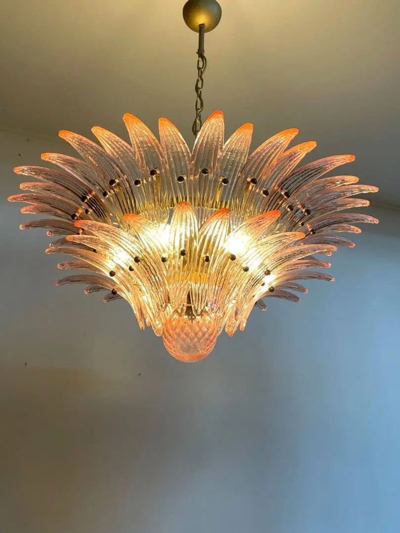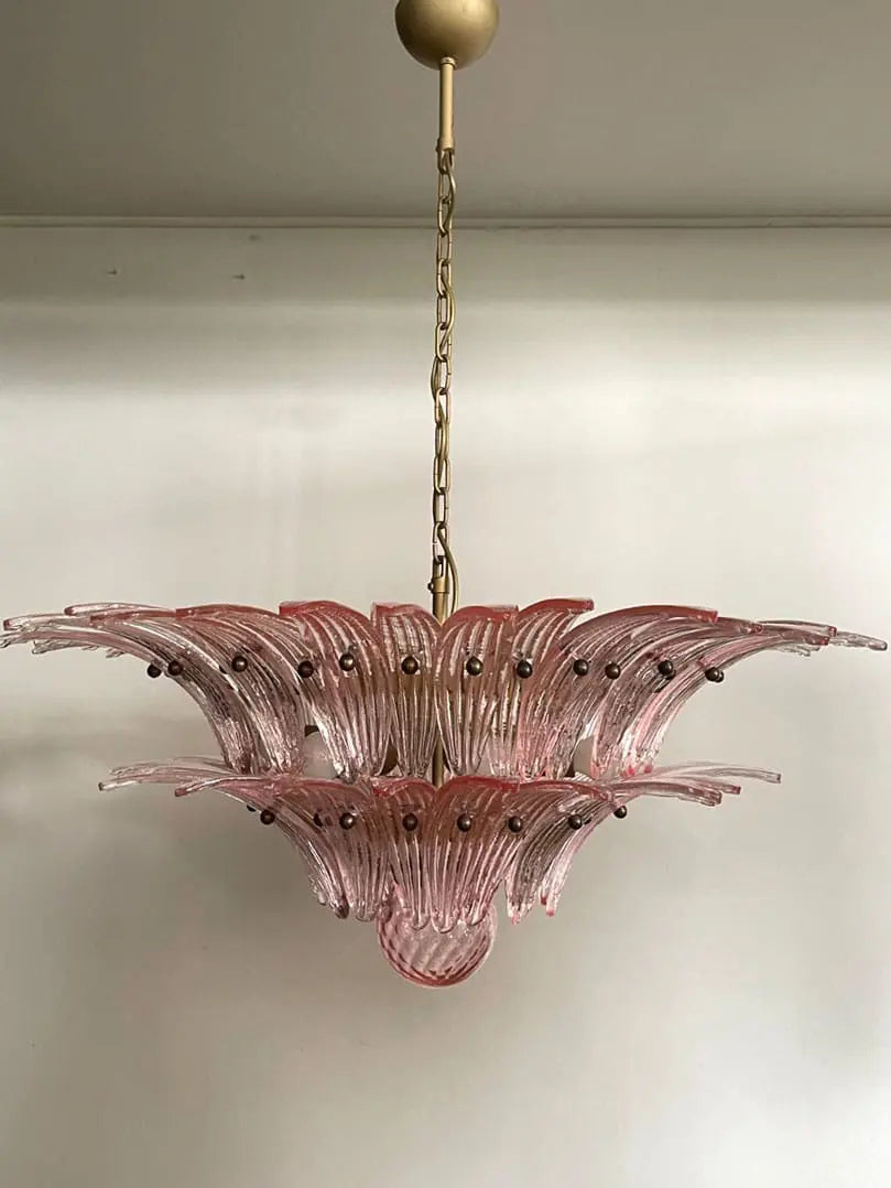 This Murano chandelier boasts a stunning Palmette design and is made with 58 pieces of high-quality pink glass. With its elegant and intricate design, it will add a touch of sophistication to any room. Handcrafted by skilled artisans, this chandelier is a true work of art.
