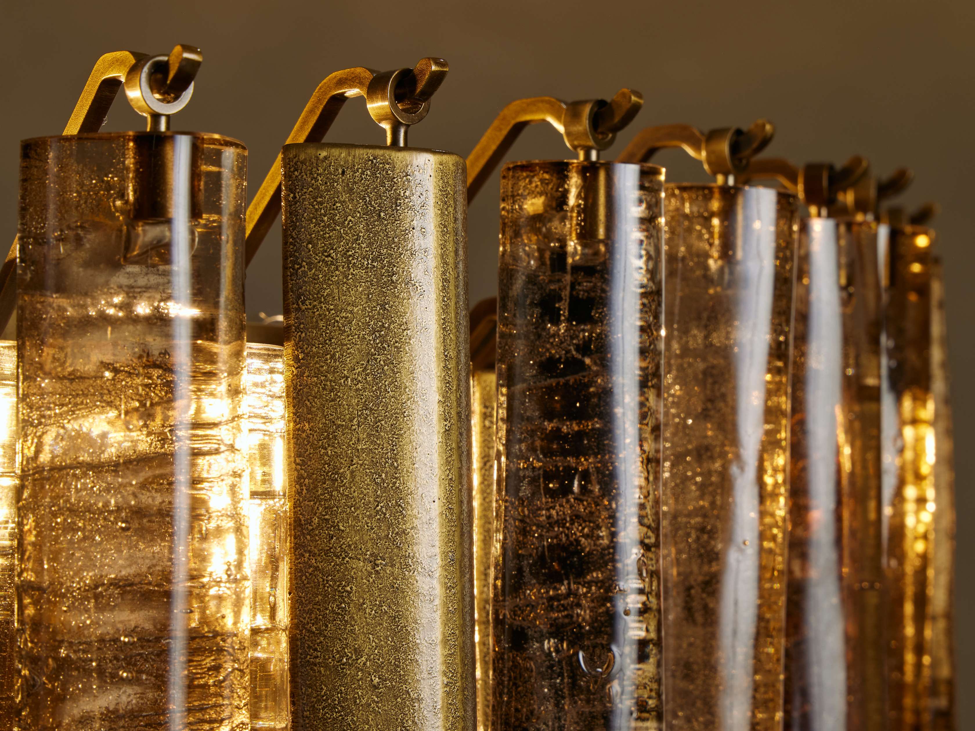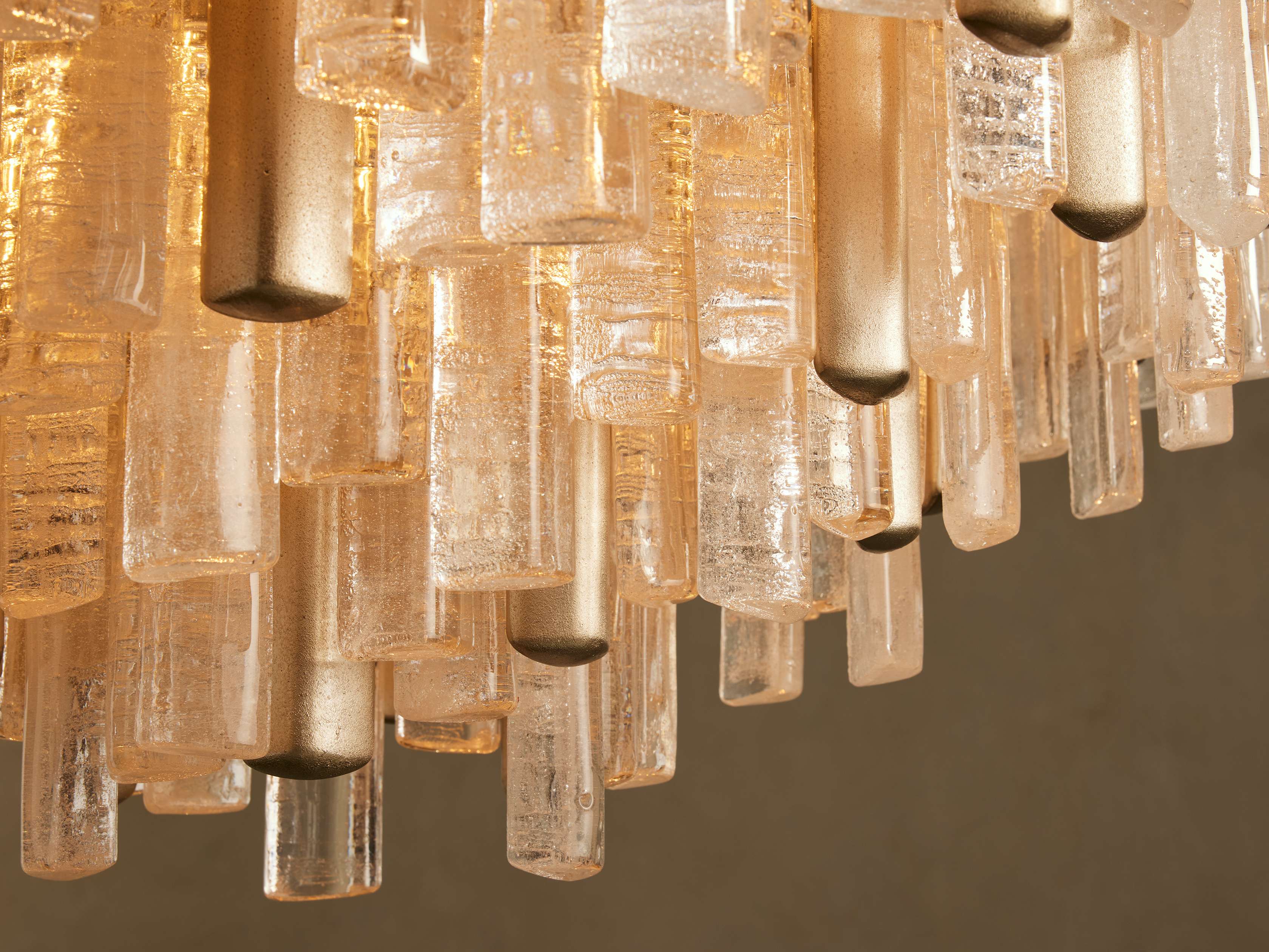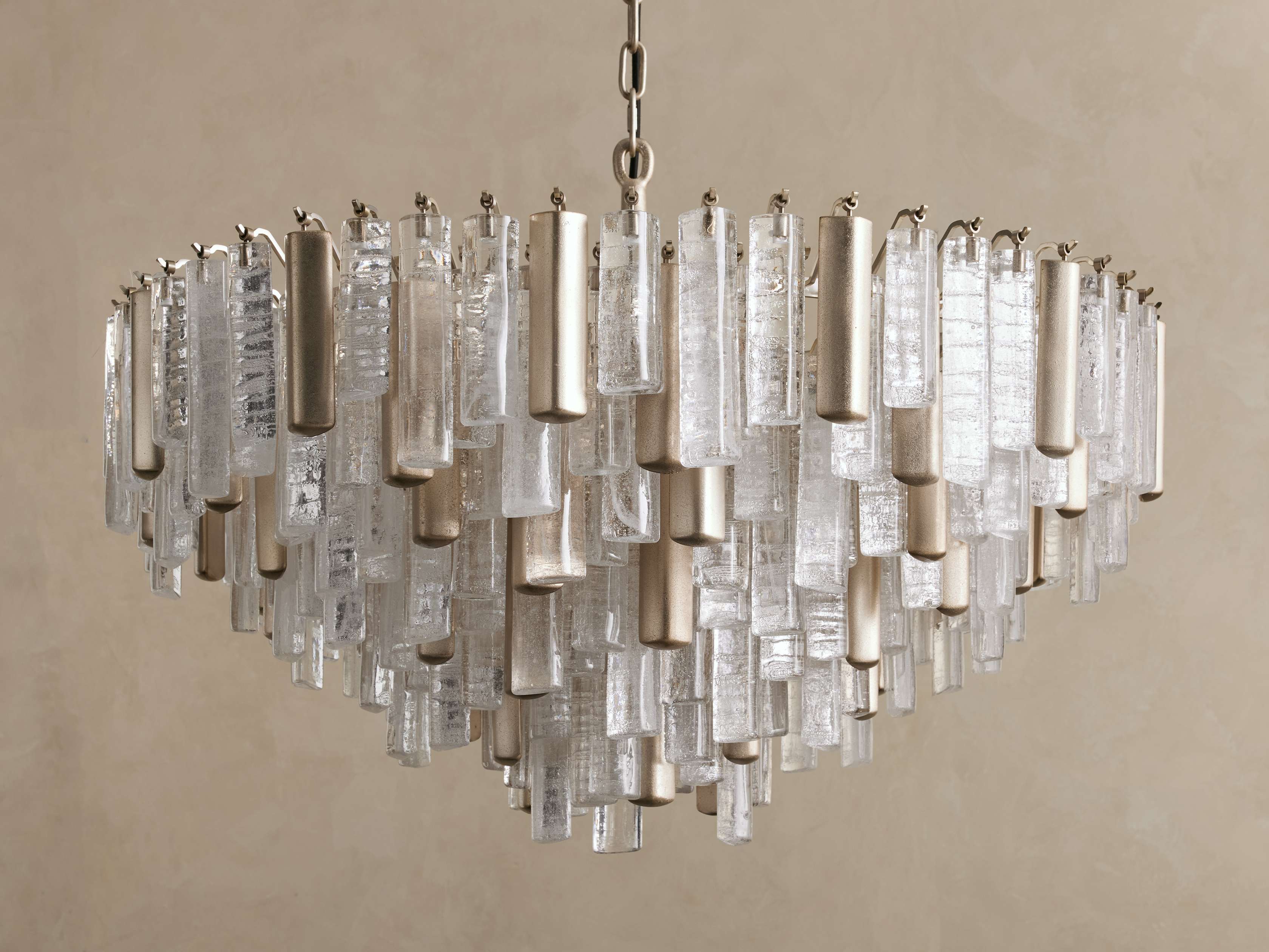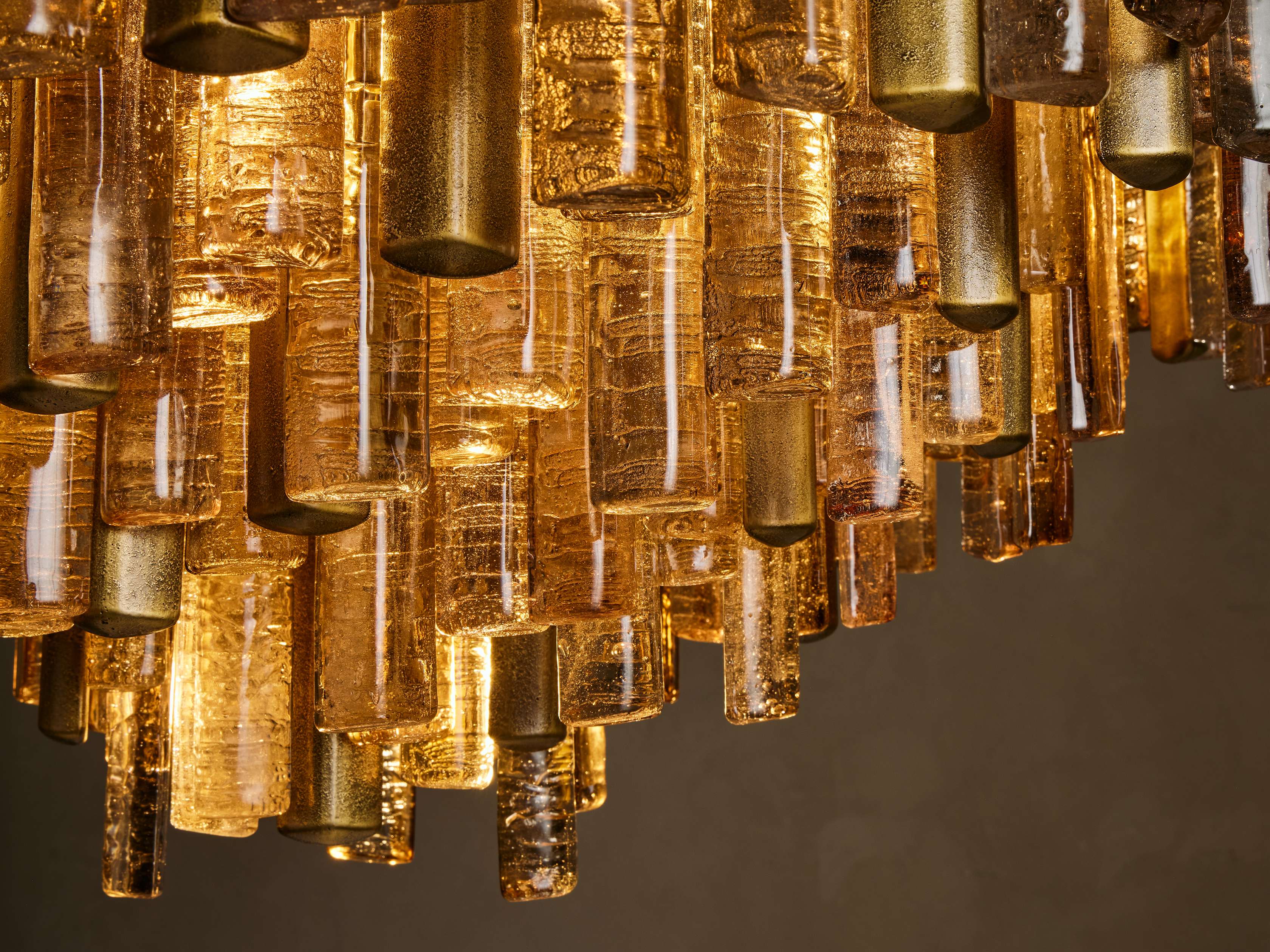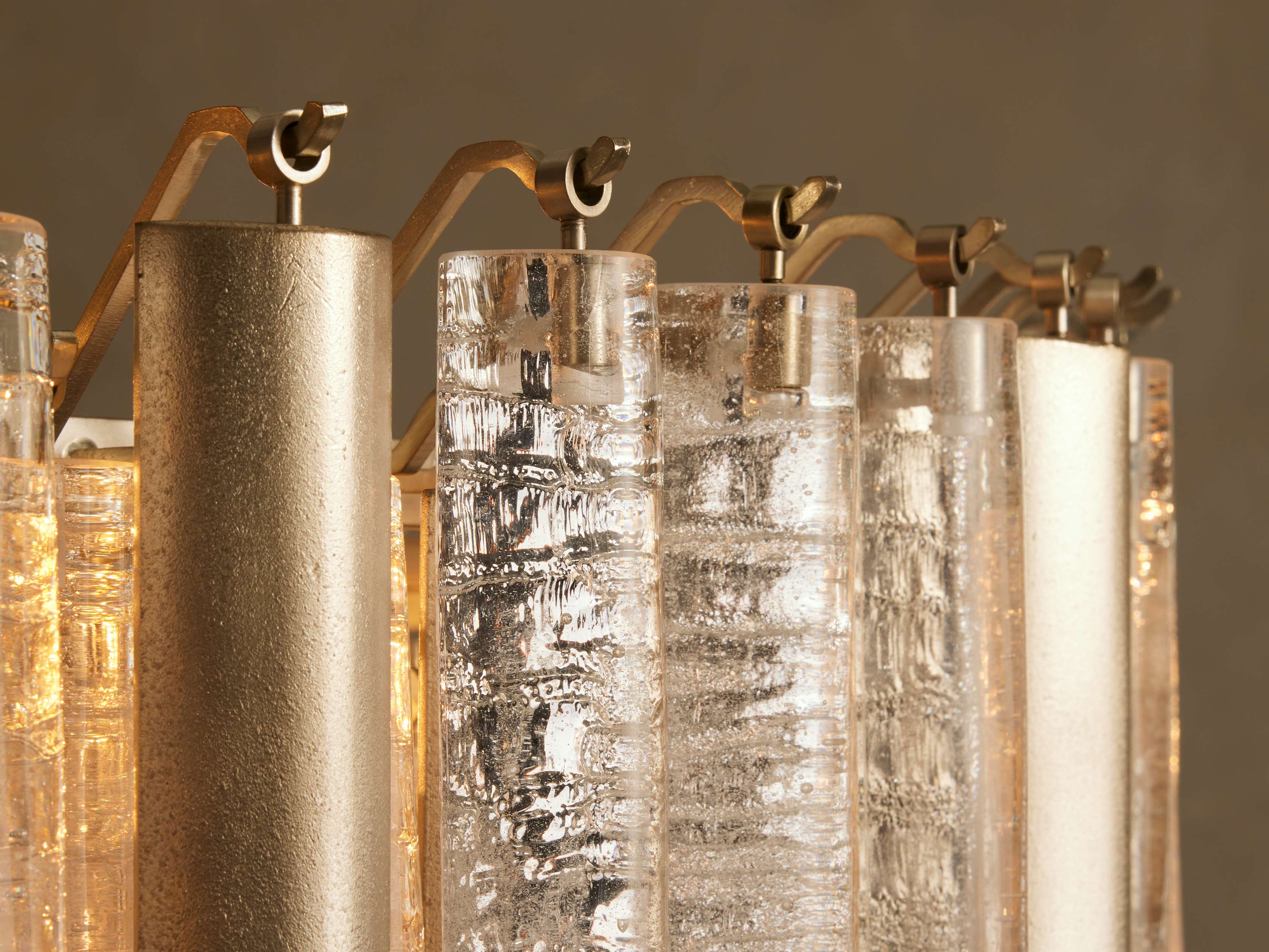 Inspired by traditional Italian Murano fixtures, our Neve Collection layers cast glass and metal into a richly textural, light-catching form. Offered in burnished brass with bronze glass or champagne silver with clear glass, each mixed-material piece glows with sculptural depth and artisanal character.