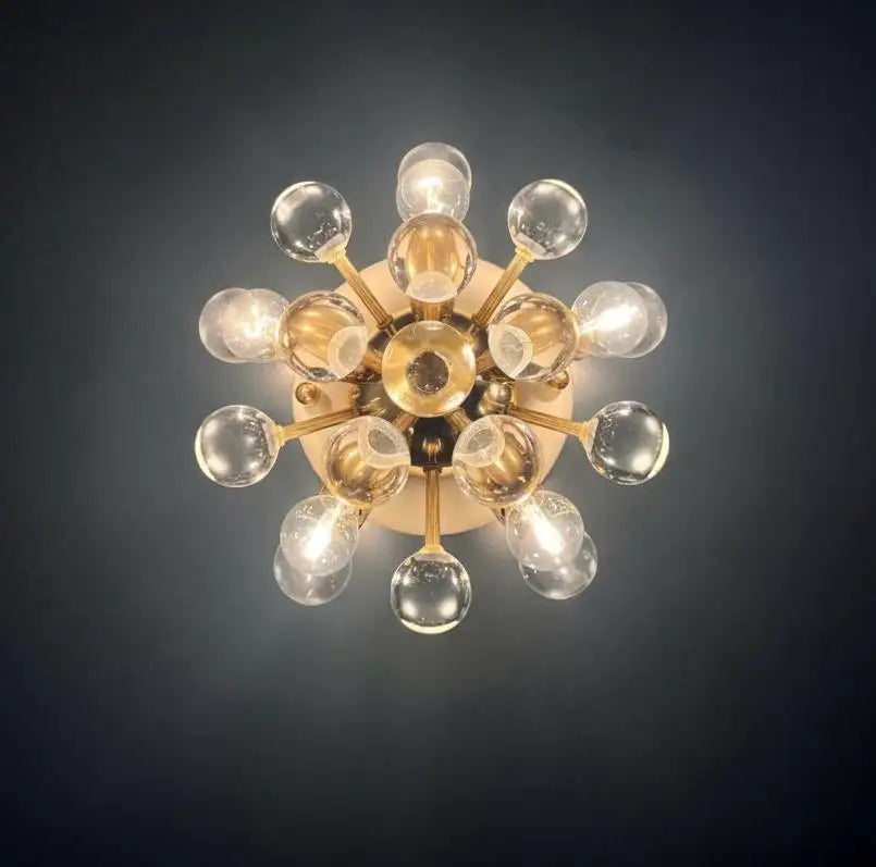 A pair of lighting fixtures, which can be either a wall lamp or a ceiling light, given their configuration; they feature a Sputnik/Mid-Century Modern design, characterized by a futuristic, ray-like aesthetic. Comprising a central circular structure in white or ivory, from which slender, polished brass arms radiate symmetrically, each arm culminating in a solid, transparent glass sphere, made of exceptionally high-quality glass.