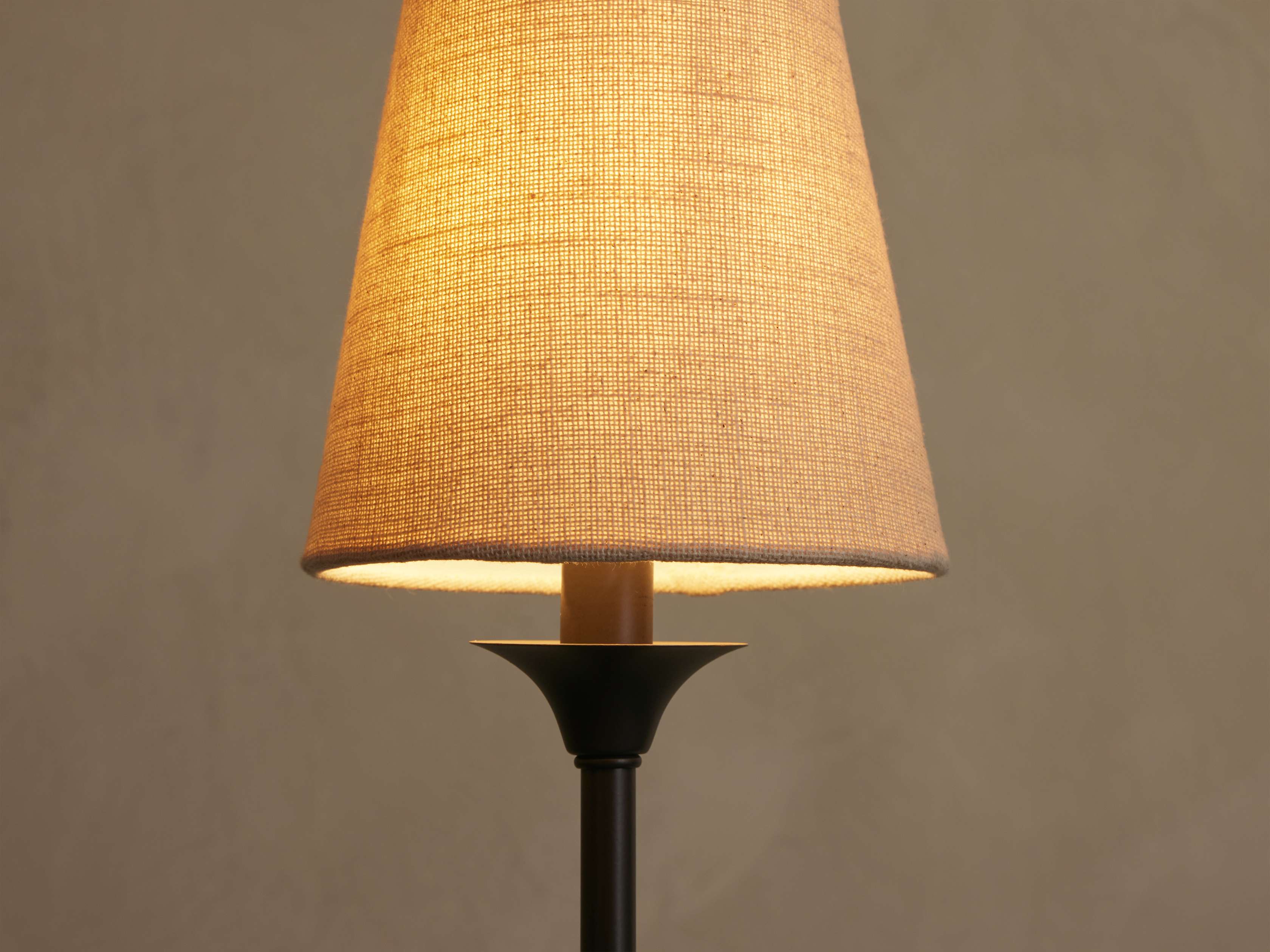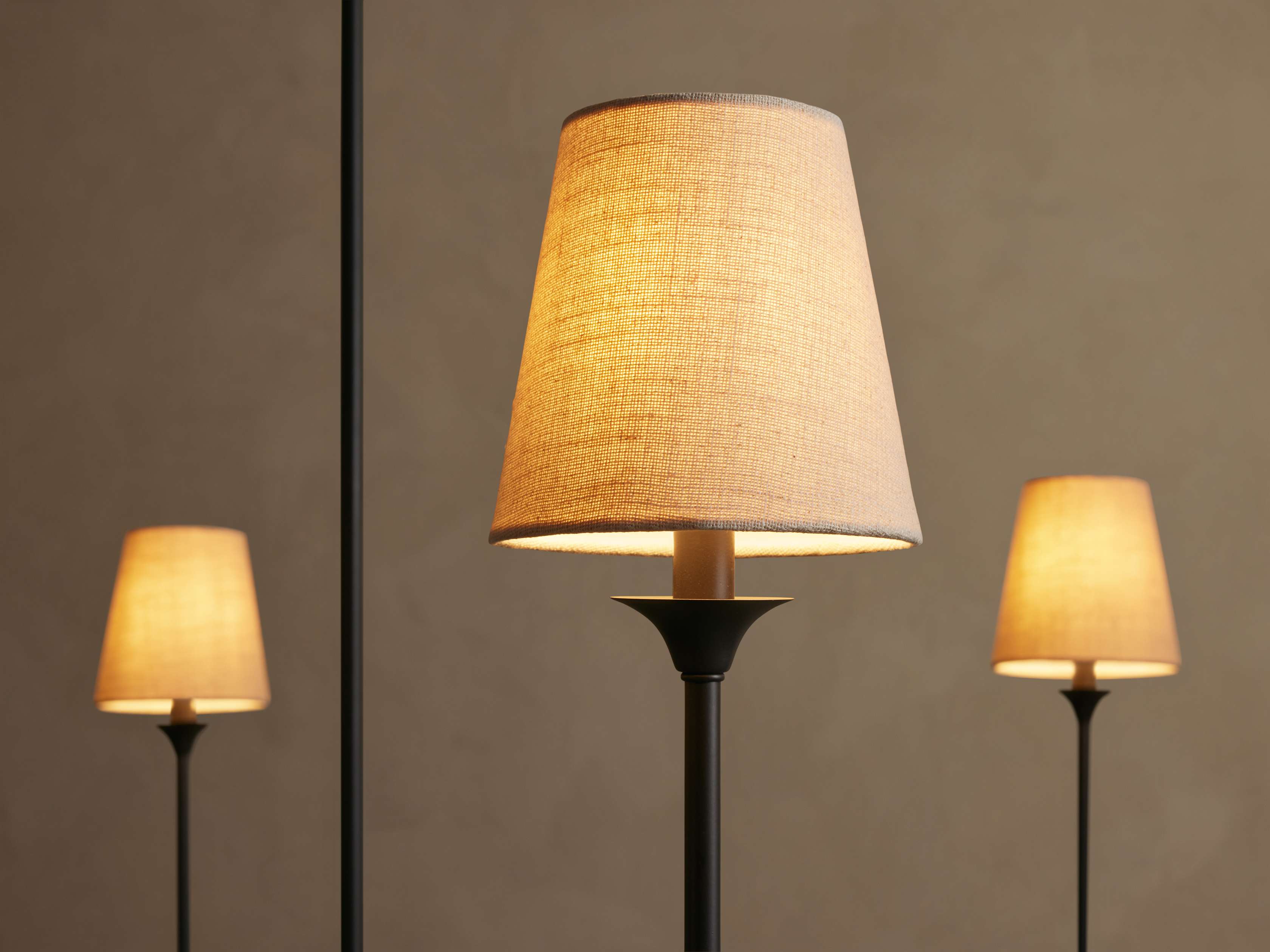 • Crafted from metal in either a brass or bronze finish, topped with off-white clip-on shades.