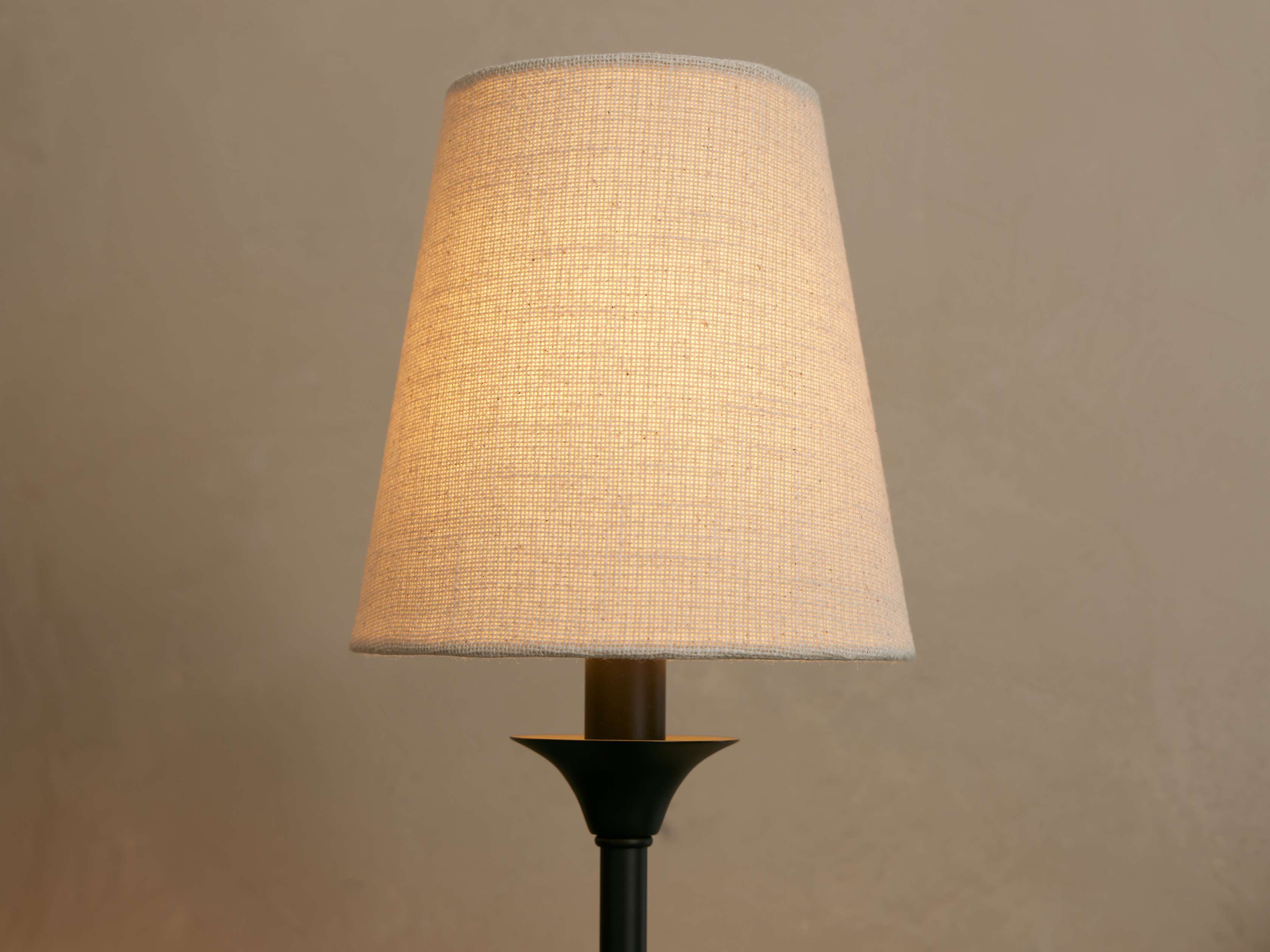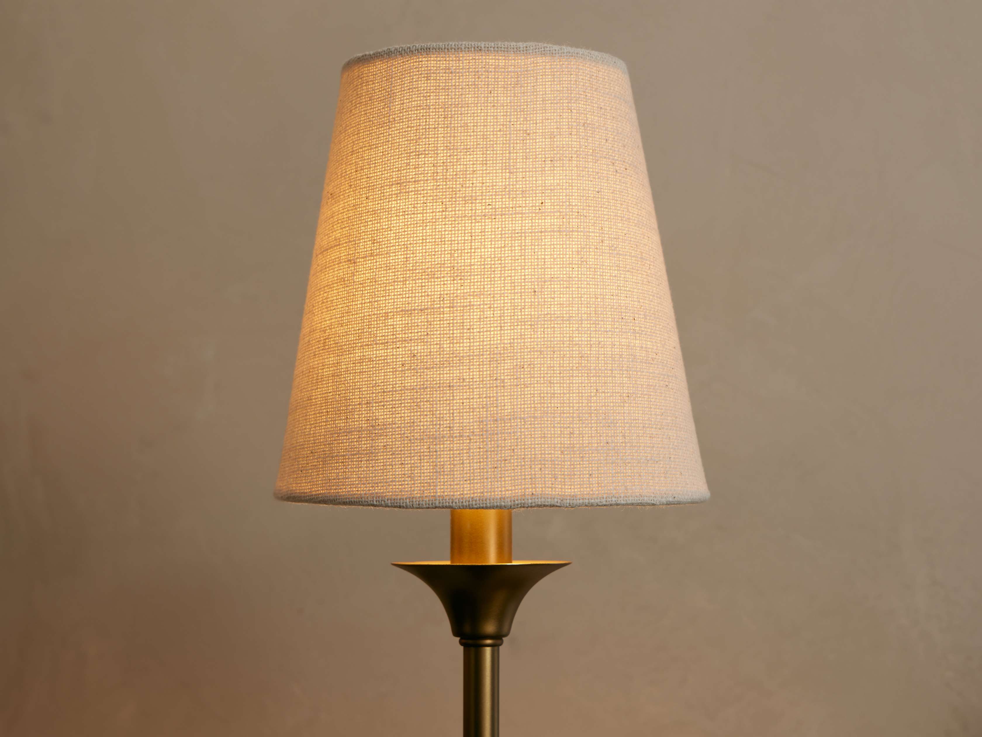 • Crafted from metal in either a brass or bronze finish, topped with off-white clip-on shades.